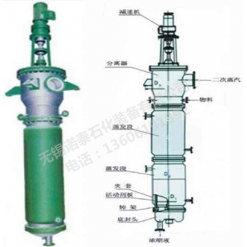 刮板式薄膜蒸發(fā)器是利用高速旋轉(zhuǎn)將液體分布成均勻薄膜而進(jìn)行蒸發(fā)或蒸餾的一種蒸發(fā)、蒸餾設(shè)備,也可進(jìn)行脫臭、脫泡反應(yīng)及加熱、冷卻等單元操作,可廣泛適用于中、西制藥、食品、輕工、石油、化工、環(huán)保等行業(yè)。